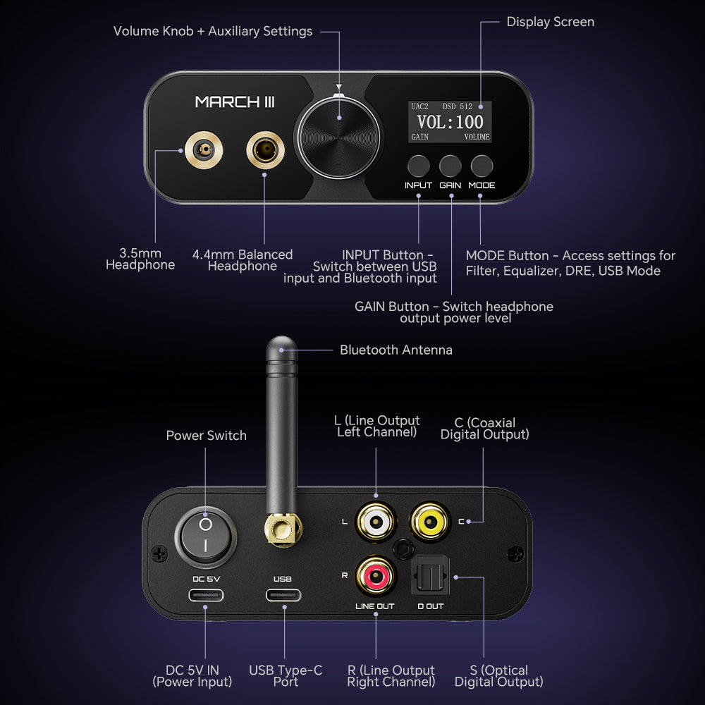 The March M3 also features gain control, FILTER adjustment, and equalizer (EQ) functions within the headphone system, allowing you to conveniently enjoy music with various playback devices.